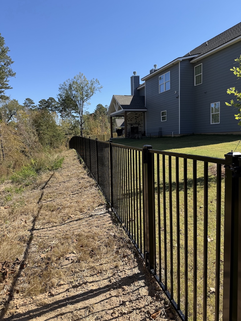 This fence installation in Evans, GA features a 6’ Shadowbox wood fence paired with a 4’ black aluminum section, creating the perfect balance of privacy and open views.